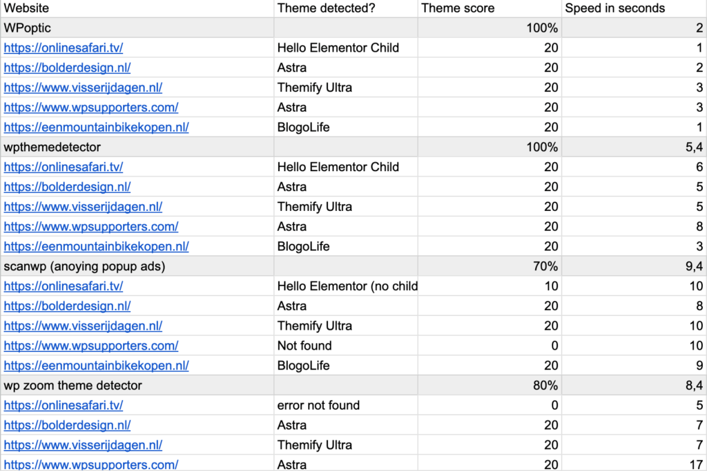 Each detector was tested on the five WordPress websites that we own. The theme names listed here are the ones detected during testing, and the speeds are the averages from the table in the previous chapter. The notes describe whether the detector recognised the correct theme, detected child themes, and any other patterns that stood out.