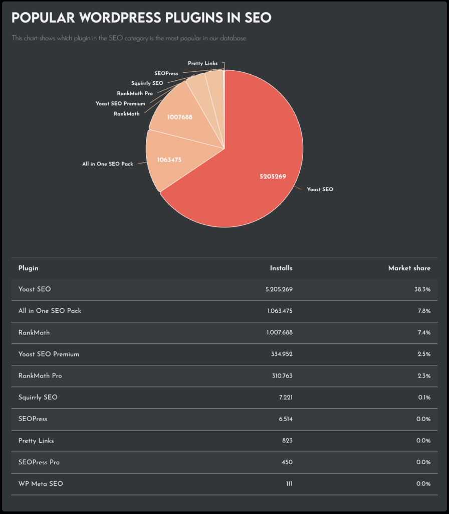 Smaller plugins like Squirrly SEO and SEOPress make up less than 0.1 percent of active installs in our database, showing just how concentrated the market is. These tools mostly find their place on projects with very specific needs.